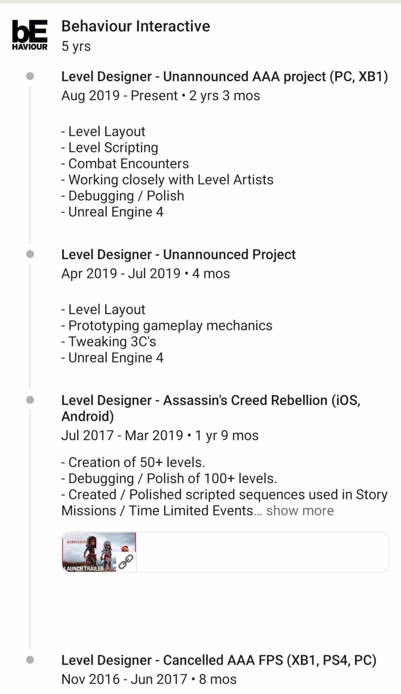 Come possiamo, prima di tutto, arrivare a dire una cosa del genere? Perché, proprio dal profilo LinkedIn di uno sviluppatore di BI, si evince che qualche cosa di molto grosso bolle in pentola. Come è possibile vedere da un post Twitter, Jérôme Cyr c’è un grande progetto AAA che ancora non ha un nome definito e non accennato. Un lavoro che ha determinate caratteristiche ben definite.
