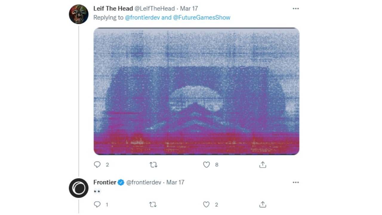 In particolare vogliamo fare i complimenti all’utente Twitter LeifTheHead che sembra aver analizzato il sonoro del video attraverso uno spettrografo pubblicando poi l’immagine che ne è uscita come risposta al tweet. Una immagine che sembra fatta apposta per i giochi Frontier Development e che pare mostrare una sorta di costruzione. Noi, e lo diciamo in tutta onestà, abbiamo ascoltato l’audio almeno una cinquantina di volte mandandolo avanti e indietro ma non siamo riusciti a cavarne un ragno dal buco. Se a voi ascoltandolo si accendesse qualche lampadina fatecelo sapere. Anche perché occorrerà aspettare ancora fino al prossimo 24 marzo quando in occasione del Future Games Show di primavera questo titolo misterioso verrà ufficialmente rivelato al mondo anche in diretta Twitch.