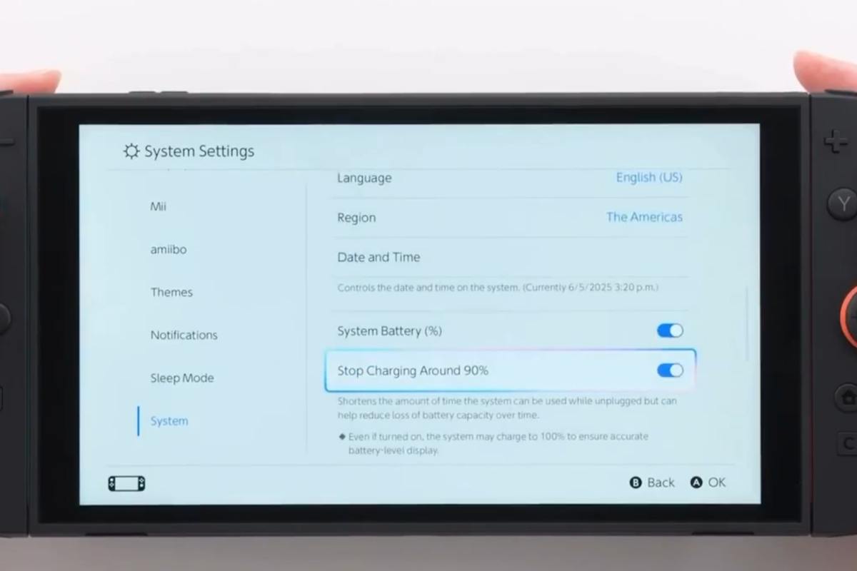 Nintendo Switch 2 has an option to stop charging the battery at ~90% 🎮