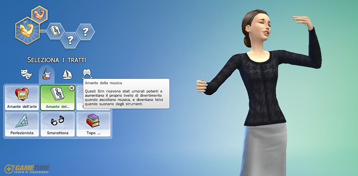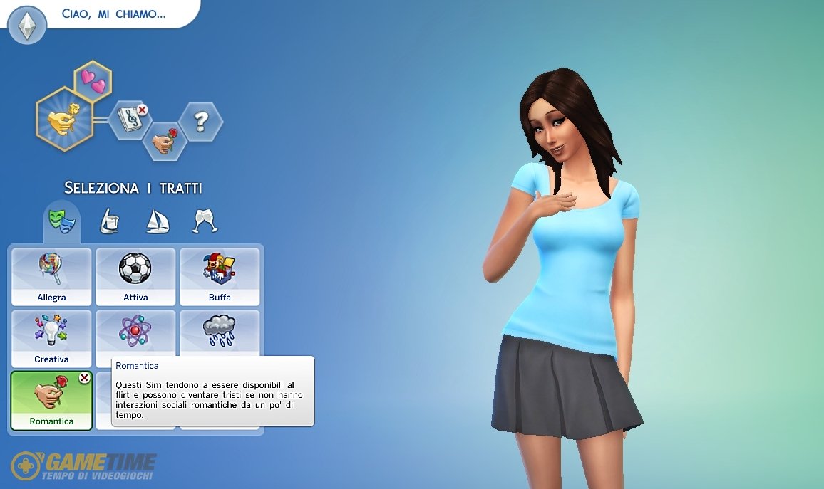 Proseguendo con la creazione della personalità si possono riempire tre slot dedicati ad altrettanti tratti, in modo simile a The Sims 3, scegliendo fra i gruppi: Emozionale, Hobby, Stile di vita, Sociale.