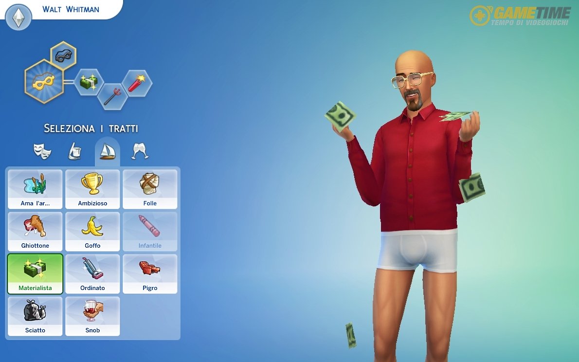 Per il nostro personaggio abbiamo la camminata “da duro”, che si sposa perfettamente con la sua personalità, oltre a tratti come “materialista”, “malvagio” e “testa calda”. Questo sim è un vero criminale…