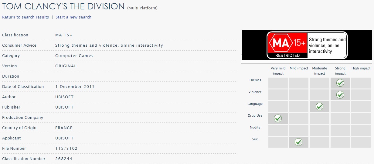 Tornando alla classificazione, Tom Clancy’s The Division riceve una valutazione “M15+”, cioè “contenuto maturo adatto ai maggiori di 15 anni”.