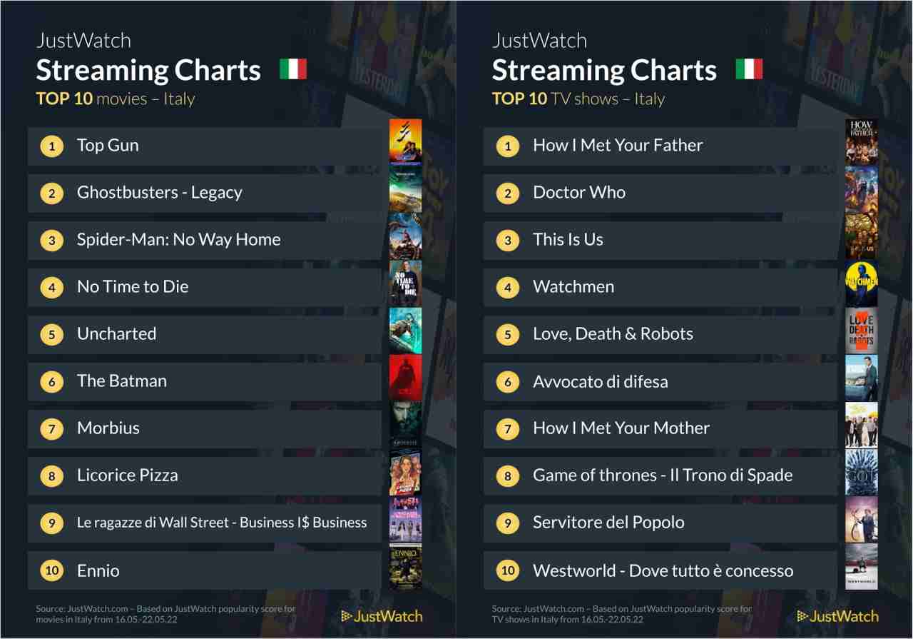 La classifica delle serie TV continua invece a darci in prima posizione lo spin off di How I Met Your Mother che va in onda su Disney+ ma tallonato da vicino dal nuovo Doctor Who e da This Is Us. La serie con il più alto tasso di fazzoletti stropicciati causa lacrime si avvia alla conclusione ed è quindi logico che tanti vogliano vedere come andrà effettivamente a finire. Sorpresa quarto posto con Watchmen. A quanto pare abbiamo bisogno di supereroi fuori dagli schemi.