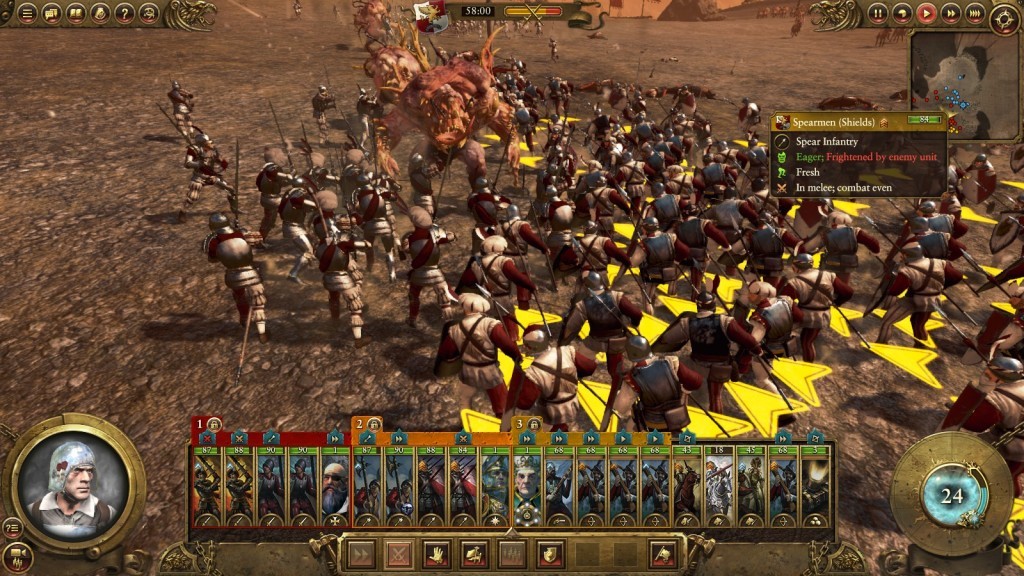 Diversamente dagli altri giochi della serie infatti non sempre un determinato tipo di unità risulterà svantaggiato nei confronti di un altro (l’esempio classico è quello della cavalleria contrapposta ai lancieri), in quanto la grandissima varietà di truppe e l’ancor maggior numero di abilità a disposizione di ognuna di queste andranno a influenzare enormemente i rapporti di forza tra i vari schieramenti. Pensiamo per esempio ai Black Knights dei Conti Vampiro. Questa unità di cavalleria è capace di causare terrore negli avversari, costringendoli alla rotta per alcuni secondi. Risulta quindi evidente che, seppur forse perdendo alcuni soldati durante la prima carica, una semplice guarnigione di lancieri Umana non può minimamente pensare di affrontare questa temibile unità di cavalleria, uscendone poi da vincitrice.