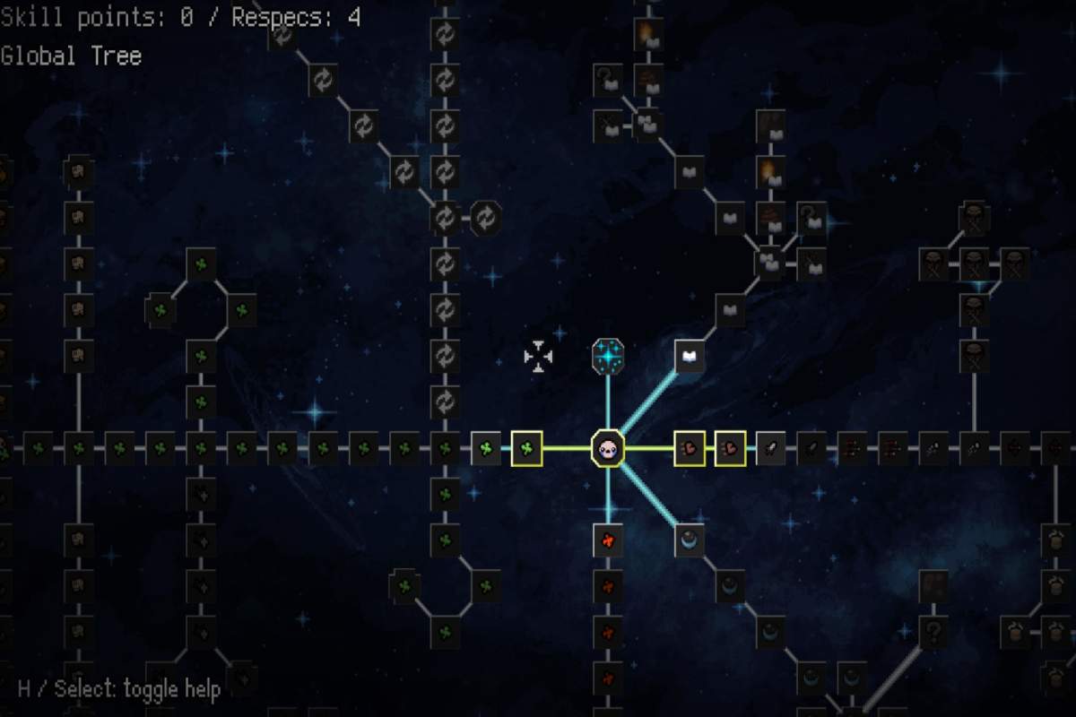 I mostri concedono XP in base ai loro HP (gli XP vengono concessi quando si libera una stanza) - Albero delle abilità passive globale con nodi che si possono assegnare utilizzando i punti abilità, i quali concedono modificatori alla corsa successiva. Si accede dal menu di selezione del personaggio.