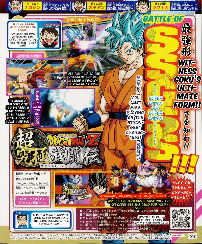 Il Super Sayan God Super Sayan apparirà per la prima volta nel picchiaduro 2D in esclusiva 3DS, possiamo vederlo nelle nuove scan di Shonen Jump mentre combatte contro Broly, Bills e utilizzando il suo nuovo attacco, la Ultimate Kamehameha.