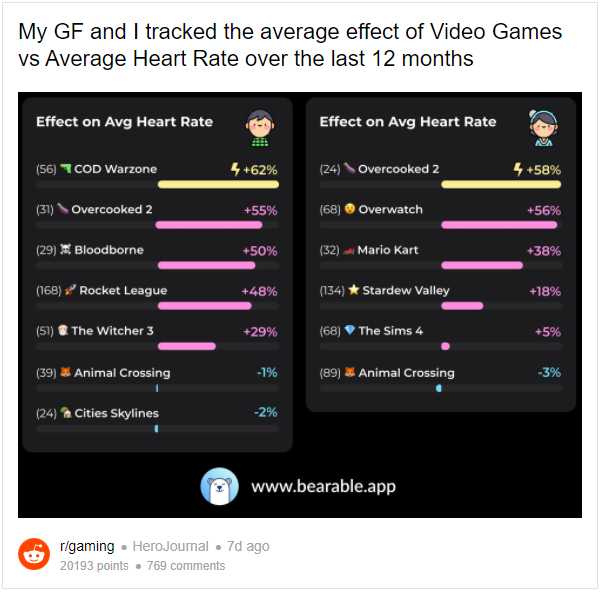 Questo è quello che si è chiesto una coppia di gamer, che ha voluto fare uno studio per capire quali sono i titoli che più hanno questo effetto sul corpo. Quindi l’utente di Reddit: HeroJournal, ha deciso di pubblicare sulla piattaforma i risultati di questo test, confrontando la sua frequenza cardiaca con quella della propria fidanzata. Andiamo ad analizzare i primi tre posti in entrambe le classifiche.