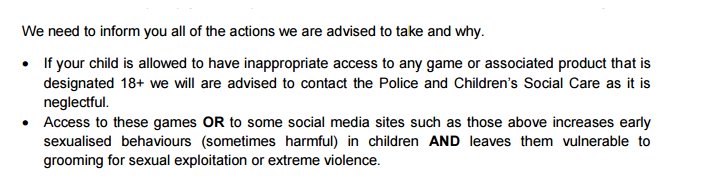 La lettera appare molto schietta, e fra le altre frasi troviamo: “Call of Duty, Grand Theft Auto, Dogs of War e altri giochi simili sono tutti inappropriati per i bambini, che non dovrebbero potervi accedere. I bambini non dovrebbero nemmeno avere account Facebook o interagire con programmi di messaggistica come Whatsapp, che non sono pensati per la loro età. I bambini dovrebbero utilizzare solo videogiochi e social network che siano identificati come idonei alla loro età“.