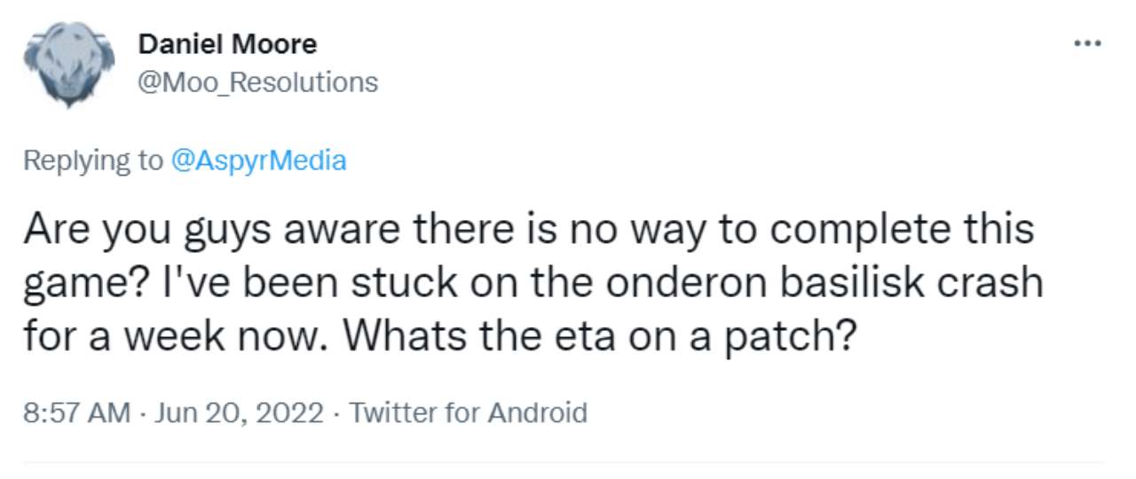 Lo stesso utente continua però a pressare l’account aspyer sottolineando di essere stato lui in realtà uno degli utenti a segnalare il bug che rende impossibile completare il gioco su Nintendo. E il suo messaggio domanda di nuovo:“Giusto per essere chiari, voi sapete che al momento non c’è possibilità di completare il gioco?” E, a questo punto, chi si occupa dell’account Twitter del team di sviluppo non può far altro che ammettere che sì, il team è a conoscenza del problema e scusarsi.