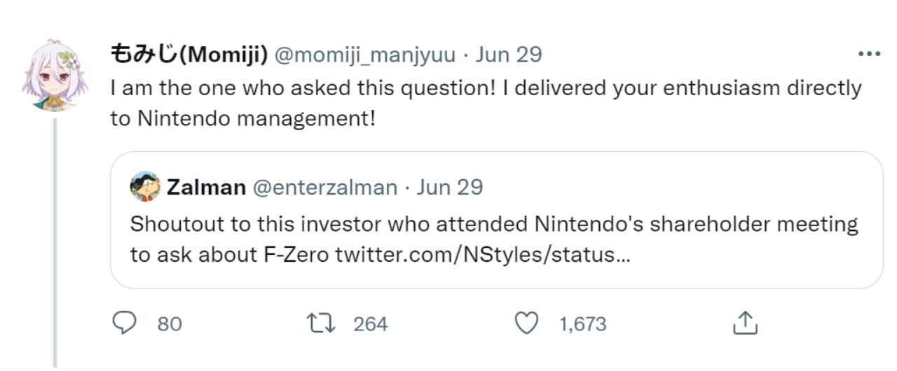 La notizia è iniziata con un messaggio pubblicato su Twitter da @enterzalman in cui leggiamo: “Una menzione speciale all’investitore che ha partecipato all’incontro con gli azionisti Nintendo per chiedere di F-Zero“. Al messaggio è arrivata una risposta, nel mare di commenti più o meno positivi riguardo il fatto che qualcuno voglia rivedere questa serie dei tempi del Game Boy, che ha sorpreso tutti. “Sono io che ho fatto la domanda! Ho portato il vostro entusiasmo direttamente al Management Nintendo!“, scrive Momiji che poi aggiunge: “Ho speso 43.212 dollari per fare questa domanda!”