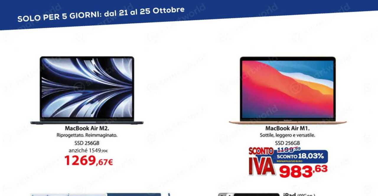 Nel dettaglio la promozione di Euronics si chiama “Sconto IVA + Extra 10%” e permette di ottenere lo sconto dell’Iva, pari al 18.03%, più un dieci per cento di sconto extra ma solo per gli elettrodomestici. Tantissimi gli oggetti tecnologici che abbiamo trovato in saldo, come ad esempio quelli dell’universo Apple. A riguardo possiamo segnalare il computer portatile MacBook Air M2 da 256Gb a 1,269,67 euro anzichè 1.549 euro. Occhio anche al MacBook Air M2 da 256Gb, acquistabile a 1,269,67 euro anzichè 1.549 euro. Per il MacBook Air M1 da 256Gb, vi serviranno invece 983,63 euro, -18.03%, mentre l’iMac 24 pollici da 256Gb è in vendita da Euronics a 1.250,91 euro anzichè 1.525,99. In offerta anche i tablet di Cupertino, gli iPad, a cominciare dal modello da 10.2 pollici Wi-Fi di nona generazione, in vendita a 359,99 euro anzichè 389,99 per la versione da 64 gigabyte, e a 475,40 euro invece che 579 per quella da 256 Gb. In saldo anche la Smart Keyboard, la tastiera intelligente per iPad, in vendita a 79.99 euro, mentre per la penna di Apple, la Apple Pencil, vi serviranno 99,99 euro.
