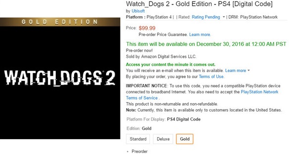 Ecco invece l’immagine che ritrae la pagina Amazon della versione Gold di Watch Dogs 2. 99,99$… chi di voi è già pronto a cliccare sul tasto “Pre-order“?