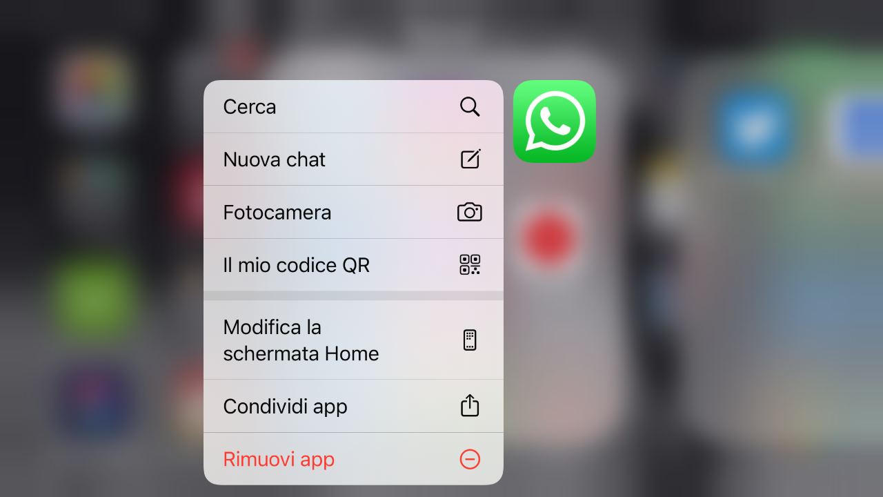 Come mostrato nell’immagine in testa al presente paragrafo, il menù di WhatsApp attivabile da desktop tramite semplice pressione prolungata dell’icona offre, sul sistema operativo iOS, le funzioni di ricerca di contenuti, di avvio di una nuova conversazione, di esplorazione del proprio codice QR, di modifica della schermata in Home, di condivisione della app (queste ultime due attraverso funzioni proprie del sistema operativo di Apple) e, infine, della sua rimozione.