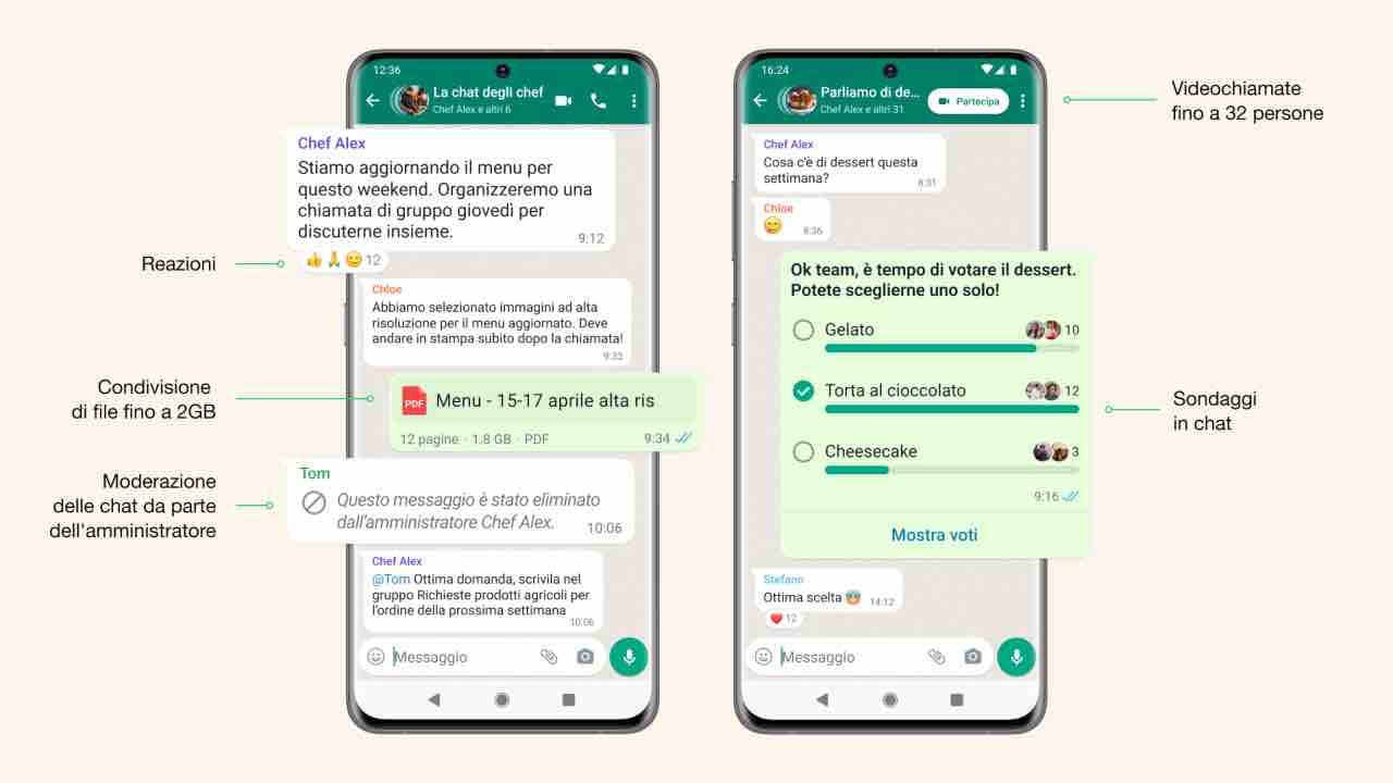 Le altre funzioni di WhatsApp, oltre all’attesissima scheda Community, passano anzitutto ai sondaggi. Sarà infatti possibile inserirli all’interno delle conversazioni, rendendo più semplice la scelta dei partecipanti ed evitando così di incorrere in servizi di terze parti. E ancora le chiamate di gruppo fino a 32 partecipanti, molto più capienti rispetto al passato. Capienti saranno anche i gruppi, ora estendibili fino a 1024 membri.