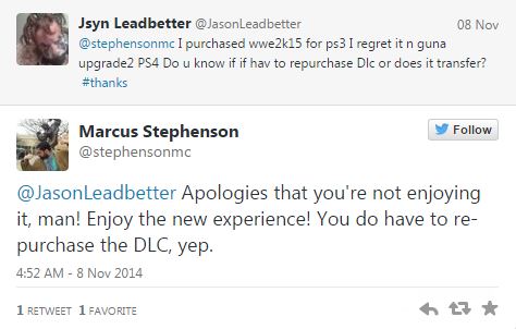 Tramite il proprio profili Twitter, il Community Manager di WWE 2K15 Marcus Stephenson ha diramato alcune informazioni legate ai DLC e al Season Pass del gioco. Gli utenti che acquisteranno tali contenuti di una versione old-gen del picchiaduro, non potranno passarli sulla rispettiva versione next-gen. Per esempio, se acquisterete il Season Pass o un DLC su PlayStation 3, non potrete passarli su PlayStation 4. La stessa cosa vale con le versioni Xbox 360 e Xbox One del gioco. Stephenson ha affermato che l’unica soluzione è riacquistare i contenuti sulla determinata console.