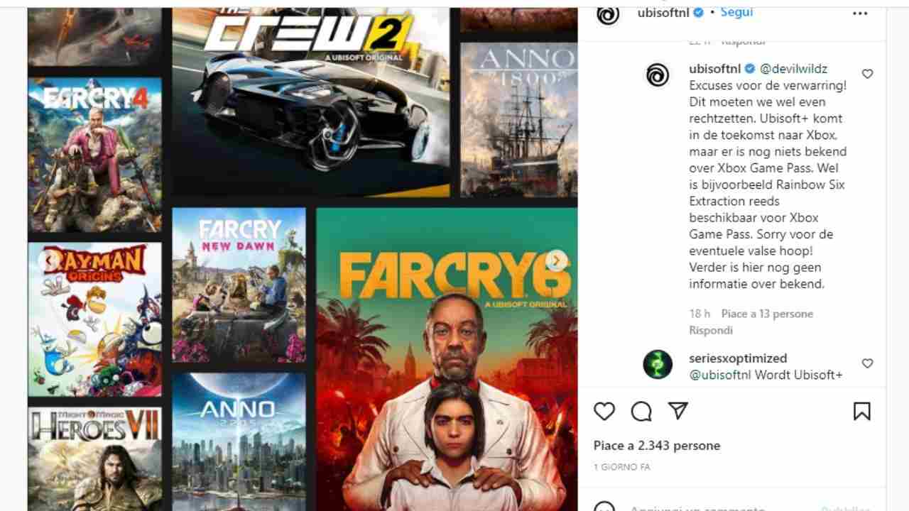 Ubisoft+ è il servizio simile a quello di Electronic Arts che, vale la pena ricordarlo, è presente anche nell’offerta Xbox Game Pass Ultimate. Tutta la questione è iniziata quando i responsabili marketing di Ubisoft Olanda hanno pubblicato una foto in cui è stato creato un lungo collage con le cover art di una vera e propria valanga di giochi Ubisoft in arrivo o già presenti sul servizio in abbonamento creato dagli sviluppatori di Assassin’s Creed e Far Cry. Un utente Instagram ha chiesto un po’ ingenuamente se questi giochi e quindi il servizio Ubisoft+ fosse in procinto di arrivare anche su Xbox Game Pass.