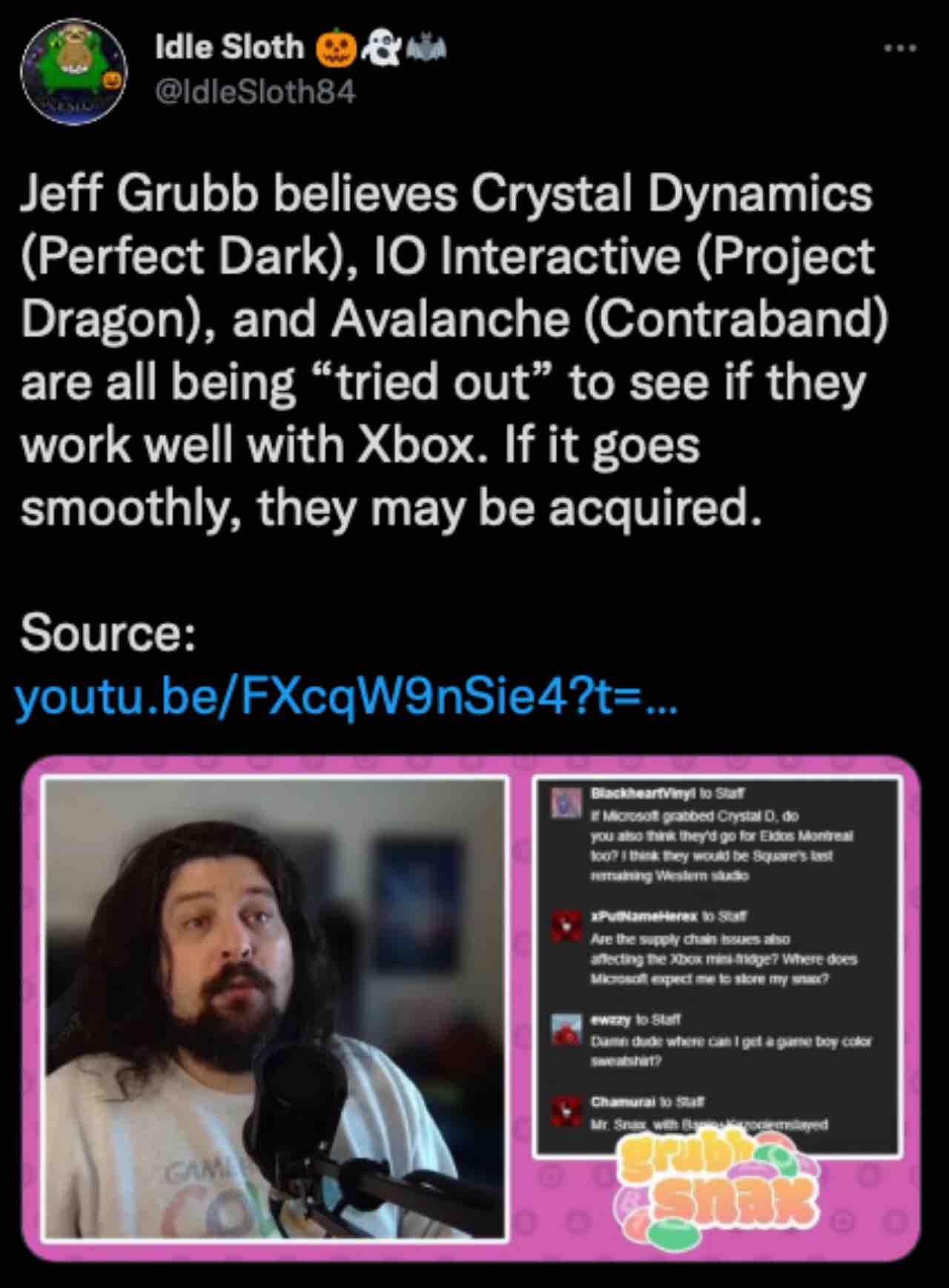 IO Interactive, Crystal Dynamics e Avalanche sono i diretti interessati di questa trattativa. Ma addirittura, secondo Grubb, si parla di un vero e proprio periodo di test. Nonostante si tratti di voci di corridoio è interessante pensare che, in riferimento all’indiscrezione, i progetti in collaborazione tra Microsoft e suddetti studi siano delle prove per capire il tipo di acquisizione futura tra le case. Ricordiamo che per IO Interactive, Avalanche e Crystal Dynamics i progetti in cantiere sono rispettivamente per un’esclusiva nota come Project Dragon, Contraband e Perfect Dark.