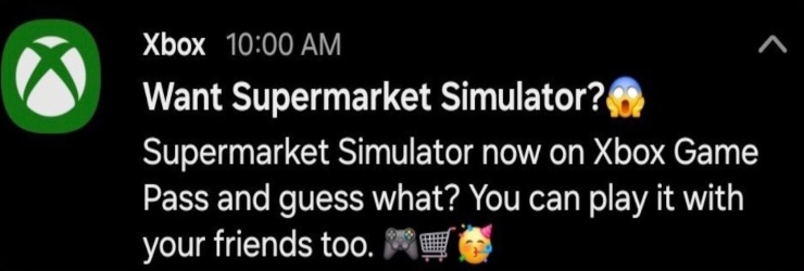 “Vuoi Supermarket Simulator? Supermarket Simulator – ora disponibile su Xbox Game Pass, e indovina un po’? Puoi giocarci anche con i tuoi amici”. La notifica è stata chiaramente inviata per errore (i giochi non vengono aggiunti al servizio in abbonamento nei fine settimana), ma questo potrebbe essere un indicatore del fatto che il videogioco arriverà su Game Pass in futuro e magari sarà protagonista di uno shadow drop.