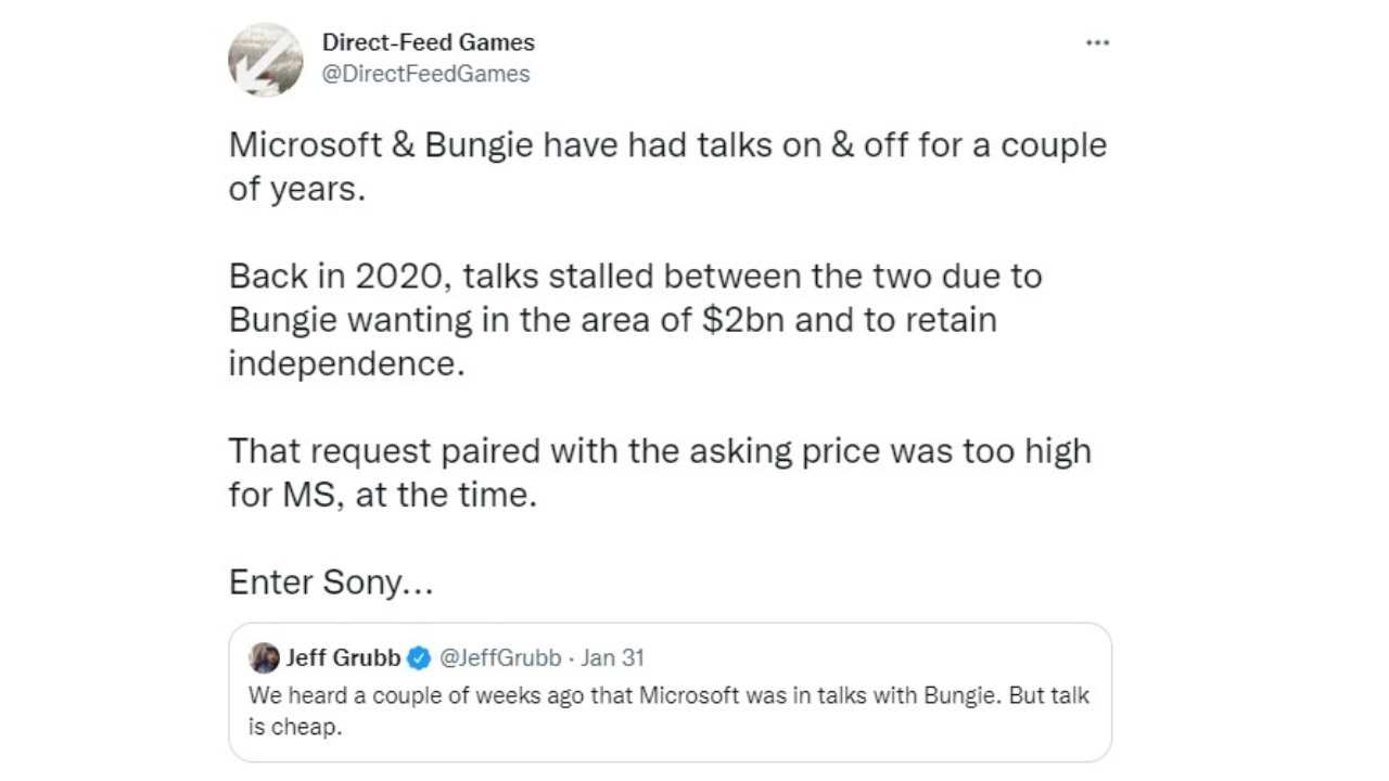 A quanto pare stando alle informazioni diffuse sul social dell’uccellino azzurro dall’account Direct Feed Games, era il 2020 quando Bungie e Microsoft avevano iniziato a parlare seriamente di una acquisizione prima che arrivasse Sony. Le trattative erano iniziate più o meno nel 2019. Tutto però è saltato a causa sia della richiesta economica da parte di Bungie per lasciarsi acquistare sia da una richiesta molto specifica che invece Xbox non aveva voluto accettare.